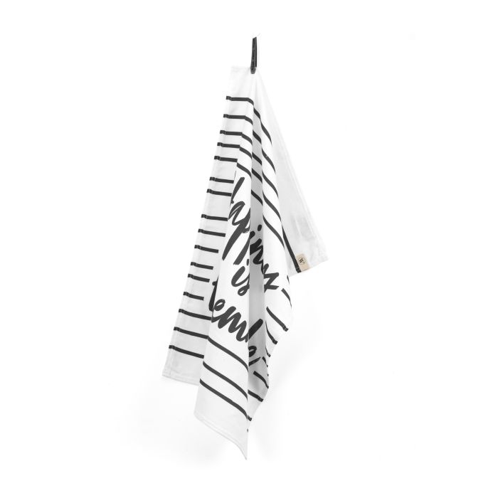Deze theedoek is bedrukt met een streepmotief en heeft in het midden de quote ‘Happiness is Homemade’. Hij heeft een goed absorberend vermogen en is na het afdrogen van de vaat in een handomdraai weer droog. De doek is van hoogwaardige kwaliteit en voorzien van handige lus. 100% katoen. 50x70 cm.