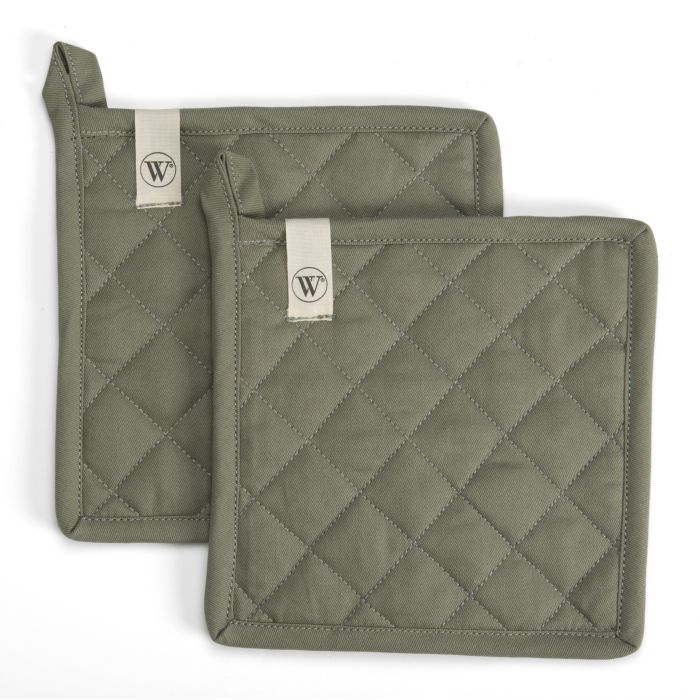 Deze pannenlappen zijn van zeer goede kwaliteit en hebben een perfecte dikte om hete pannen mee op te pakken. De pannenlappen zijn voorzien van een stijlvolle ruitstructuur en hebben een handige lus zodat ze makkelijk op te hangen zijn. De pannenlappen komen in sets van 2 en zijn verkrijgbaar in verschillende neutrale kleuren. 100% katoen. 20x20 cm. Set van 2.